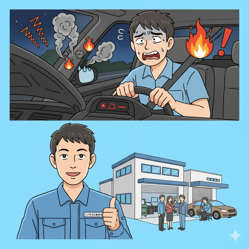 ドライブ中、「あれ?なんか変な音がするな…」「焦げ臭い気がする…」と、